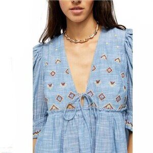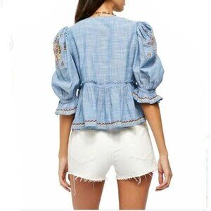FREE PEOPLE Tallulah Embroidered Chambray Puff Sleeve Cropped Top Size S