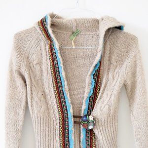 FREE PEOPLE Tan Klara Wool Cable Knit Embroidered Trim Button Cardigan | Size XS