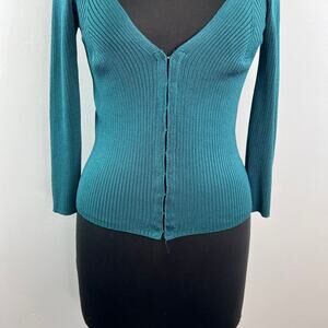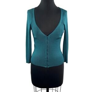 Free People Teal Ribbed Knit Deep V-Neck Sweater Long Sleeve Top Size M Medium