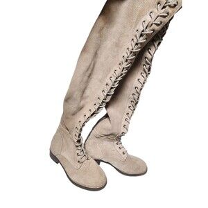The Free People Tennessee Over Knee Leather Boots in size EU 38 are a stylish and versatile addition to any woman's wardrobe. These boho-inspired boots feature a round toe, lace-up closure, and low block heel for comfort and practicality. Made from high-quality leather with a suede lining, these boots are perfect for casual outings, parties, or even traveling. The beige color and solid pattern give them a timeless appeal, while the over-the-knee shaft style adds a trendy touch. Ideal for the winter, fall, or spring seasons, these boots are sure to make a statement whenever you wear them. Marker on sole, discoloration left inner boot and top of boot.