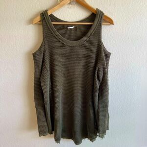 FREE PEOPLE Thermal Knit Olive Green Sunrise Cold Shoulder Sweater Womens Large