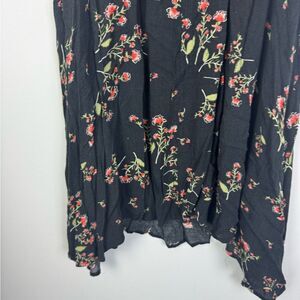 Chic and stylish, this black sleeveless top by Free People features a beautiful floral pattern in reds and greens. Perfect for any occasion. Wear it as a super mini dress or a tunic top with pants. Cutout keyhole in the front with button closure. Great preowned condition. Women’s size small.