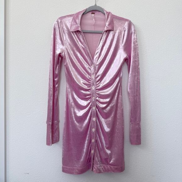 FREE PEOPLE Velvet Ruched Mini Dress Pink Collared Long Sleeve Bodycon XS Y2K