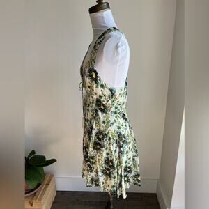 Green and yellow floral sun dress from free people. Fully lined, keyhole back, twisted straps, ruched elastic at waist. Tassled ties at front neckline.