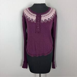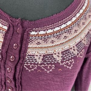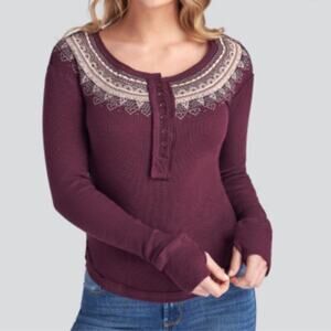 FREE PEOPLE WE THE FREE FAIR ISLE THERMAL TOP HENLEY BURGUNDY EMBROIDERED