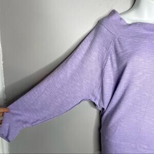 Long dolman sleeved lightweight thermal sweater with off-the-shoulder neckline for slouchy fit. Very soft and comfortable. Banded at waistline. Lilac purple color.