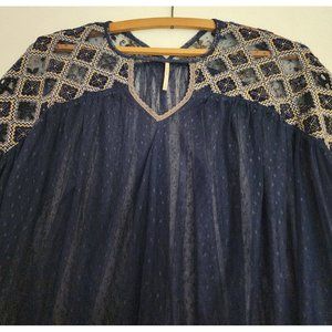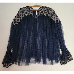 Sheer navy blue bohemian style top by Free People, Women's Small. This top features embroidered tulle, long balloon sleeves and flared embroidered sleeve cuffs. This is a fun and flirty top that would be perfect for those special occasions