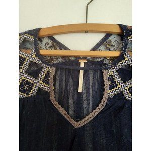 FREE PEOPLE WOMEN'S SMALL NAVY BLUE EMBROIDERED MESH JOYRIDE SHEER TOP BOHO