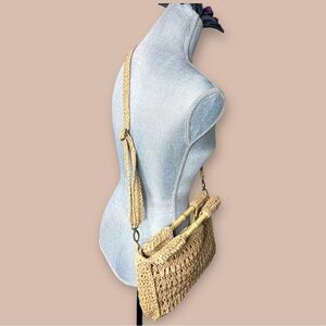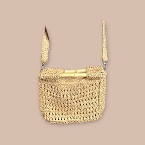 Retro style bohemian bag featuring bamboo handles, convertible strap and macrame straw Measurements: 10" Width 9" Height (starting below strap) 4" Deep Please Note: there is some peeling on the edges of the pockets. Inside of the bag does not affect the use of the baggage anyway can’t see it since it’s in the inside .