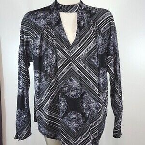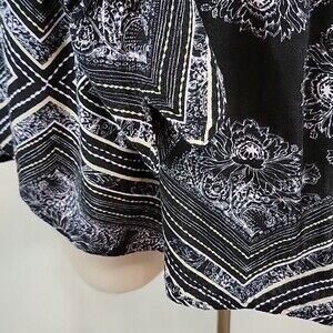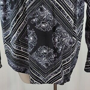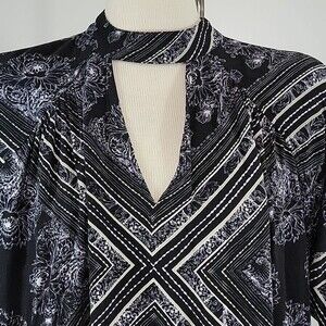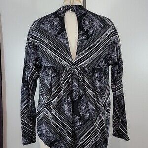 Pre-owned Free People Walking On A Dream printed tunic tip size XS. Long sleeve flowy top. V-neck front and back with button closures behind neck. Some signs of pilling/washwear. Please see photos.