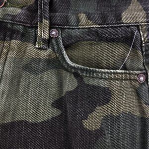 Description: Grab your military surplus jacket to style with these Free People We the Free Camo Combo Cutoffs. The FP We the Free Camo Combo Shorts have an all over camouflage pattern with a five pocket construction with distressed design. The closure has a single metal button with additional embossed Free People We the Free button fly. Rustic rivets are embossed with Free People. The distressed style extends on the front to the raw hem of the shorts. On the back, the double pockets have similar distressed detailing with the raw hem. The Free People We the Free Camo Combo Distressed Cutoffs will pair nicely with tall black combat boots. Softer touch is styling with blue or brown chambray, linen button up blouse and solid open toe, kitten heels.