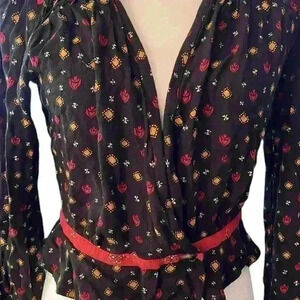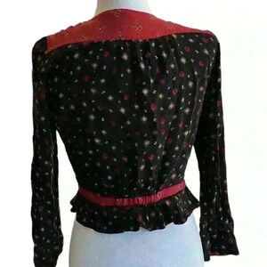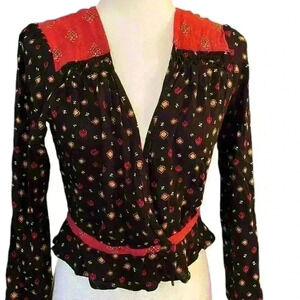 FREE PEOPLE Where We Roam Red and Black Printed Cropped Blouse Size Small. Long Sleeve One Button Closure, missing a Button, can be worn close as a V neck or open with a tank top underneath. Good pre owned condition