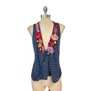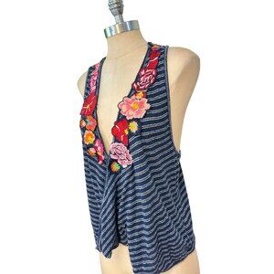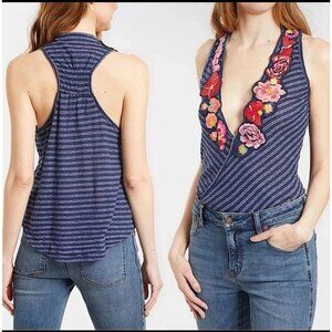 FREE PEOPLE Women Frida Navy Stripe Floral Surplice Tank Appliqué Medium