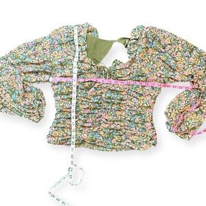 This gorgeous blouse features a ruched bodice, puff long sleeves, sweetheart neckline with tie detail, and an open back with smocked panel for a flattering, feminine fit. The soft pastel floral print adds a romantic, boho vibe — perfect for festivals, brunch, or date nights.