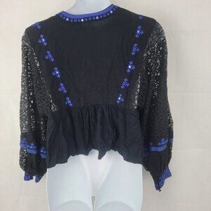 FREE PEOPLE Womens LARGE Shirt Blouse Boogie All Night Lace Black Blue