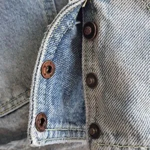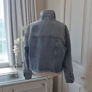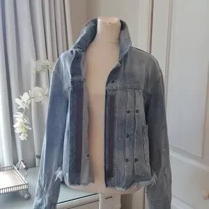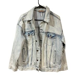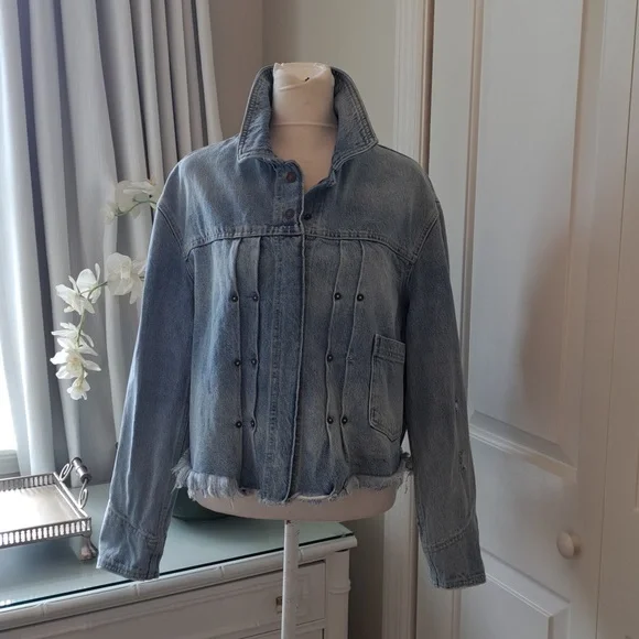 Trending brand Free People women's light distressed wash denim jean jacket with front zipper, vertical front pleats, stud details, raw loose hem and front pockets. Pre-owned and in very gently used condition. one snap is missing coordinating closure on left cuff. Please see pictures.