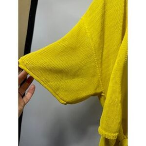 Open front wrap style. Elbow dolman sleeves. Tie waist belt with ring buckle. Cropped. Knit fabrication. Bright yellow. Stretch material. Lightweight. Vibrant. Bold. Layers. Dress up or down. Versatile.