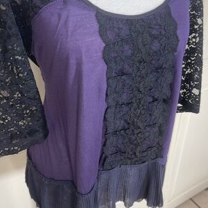 features delicate black lace sleeves, lace trim along the back of the shirt, and lace that continues down the front. The bottom of the top is adorned with a blue/purple ruffle and unfinished hem. The material is fairly thin and may require a camisole or tank underneath