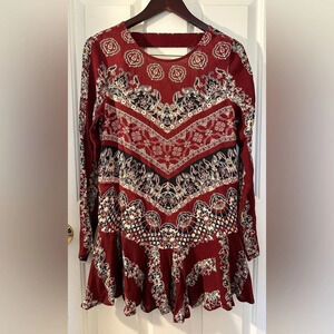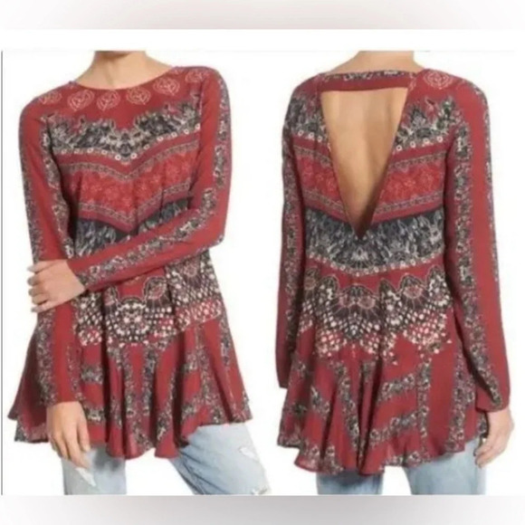 FREE PEOPLE XS Anthropologie ALLURING Maroon Printed Backless Long Sleeve Tunic