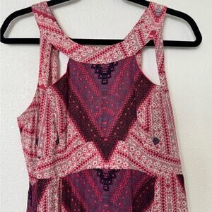 This vibrant purple and red You Made My Day maxi sundress by Free People features a chic cut-out design and a backless halter neckline, perfect for casual or resort wear. The sleeveless maxi length offers a flowing silhouette, ideal for warm, sunny days. Crafted with a focus on comfort and style, this dress is a must-have for your summer wardrobe. 0111