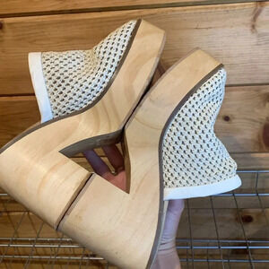 Free People Claudia clogs with cream crochet upper with wooden platform sole. No callouts to note, minor wear on soles. Marked a euro size 39 which is a US 8.5. Stock photo added for reference from the website.