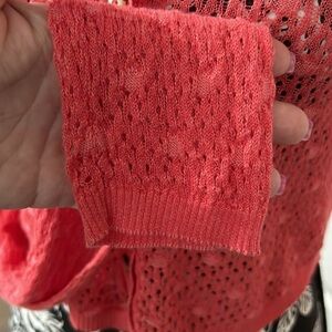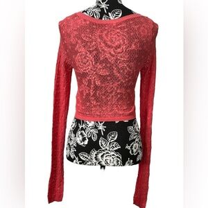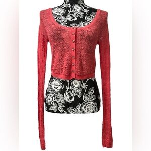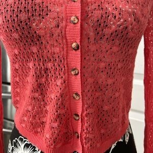 Free People cropped lightweight cardigan in a delicate crochet-like design, perfect for layering. This piece features a vibrant coral color and a relaxed, boho-inspired vibe. Sized extra small, it’s ideal for adding a pop of texture and color to any outfit. In excellent preowned condition, this cardigan is great for transitioning between seasons or pairing with high-waisted jeans, skirts, or dresses for a chic look!