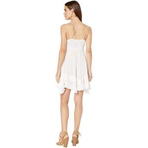 A Free People flowing slip dress with a crochet at the bodice and an asymmetrical ruffled hem.