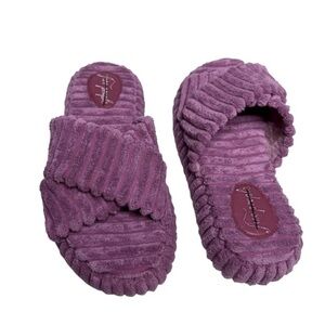 Features: Slip-on style, thick ribbed terry fabrication,chunky criss-cross toe strap, slight platform sole, lined footbed
