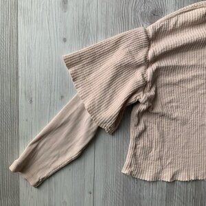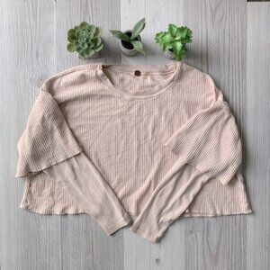 Free People One top. Pale pink. Cropped length. Knit texture. Long sleeve. Ruffled sleeves. Raw edge hem. Relaxed fit. Womens size small. Discoloration on left sleeve and right belle sleeve, shown in photos.