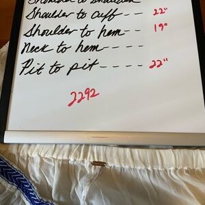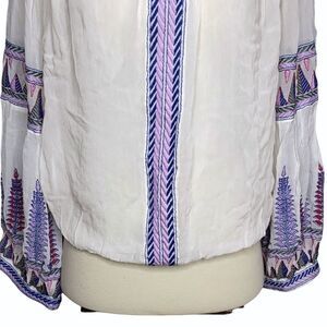 Gorgeous blousy top with embroidery on the sleeves and down the front and collar. Cuffs and waist are elasticized.