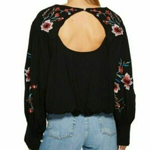 FREE PEOPLE Lita Embroidered Top Blouse Cutout Long Sleeve Boho Black S