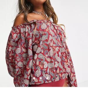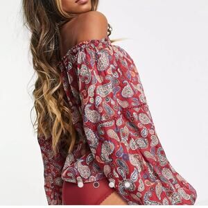 The vibrant paisley print of Free People's bodysuit will fit in perfectly with tropical locales. Spun from flowy cotton, it has a gathered neckline, blouson sleeves with pull strings, and is cut for a roomy relaxed fit.