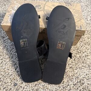 The product is a pair of Free People Temperatures Rising sandals in black with gold accents, designed for women in US shoe size 9. These slip-on sandals feature a leather upper material and come new in their original box. With a stylish combination of black and gold colors, these sandals are a fashionable and versatile option for any casual outfit.
