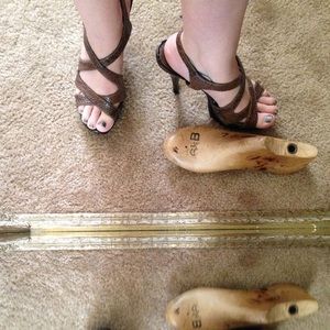the stiletto part of the heel (shown) took a beating, but they were only worn once. Criss cross wrap around with ankle support. The actual heel is brown patent leather. Upper is snakeskin. Comfy and very supportive of the ankle, you could dance all night and be okay. Size 6