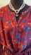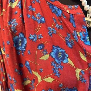 Stylish red dress with blue floral pattern. Features button-up front and cinched waist.