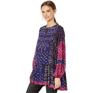 Let your free spirit shine in this drapey ruffle-hem tunic styled with billowed sleeves and a lively boho print.