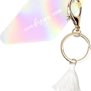The iridescent acrylic keychains include a gold clamp, key ring and white fringe tassel. Requires easy assembly.