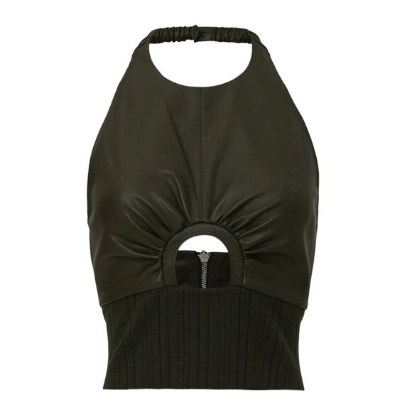 Dark military green vegan leather. Halter neck top. Half moon cut-out.