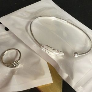 Shiny 925 silver Feather or Leaf Bracelet & Ring Gift Set includes 1 cuff bracelet and a matching wrap ring.