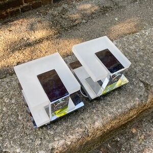 Postmodern style. Used in great condition, could use a wipe down with mild soap. Nothing wrong with them, we just went a different direction with our space. Cost per sconce is $168 each brand new, paid over $360 for them about a year ago. *No bulbs included.