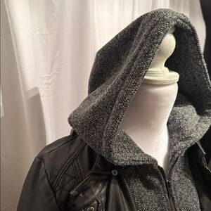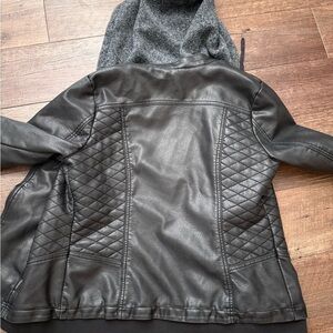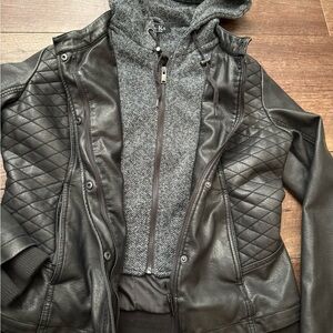 Vegan Leather jacket black and gray. Double zipper and buttons. Side pockets. Great for a night out on the town or any occasion