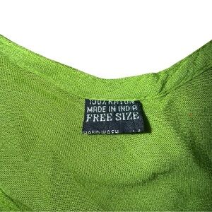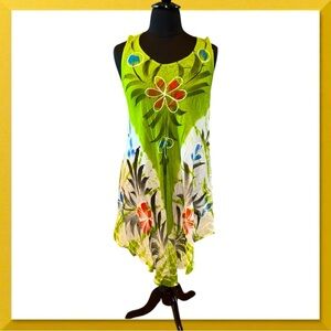 Free-size dress with a vibrant green tie-dye painted pattern at the top, transitioning to white towards the bottom. It features a sleeveless design and a slightly asymmetrical hemline. The dress is adorned with floral motifs in red, blue, and white, with black and green leaf-like accents.