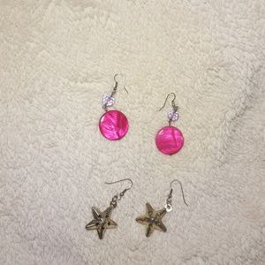 The dangling star earrings, have a worn gold/silver vintage look and hang 2"... The pink circles are shiny and pearly and have a little purple Stone above them, they are like new but one circle is chipped see pics ** Adorable Punk Rock Style! DD TO BUNDLE WITH YOUR CHOICE OF ITEM AND I WILL SEND YOU A DISCOUNT OFFER WITH THE EARRINGS PRICE NOT INCLUDED!!