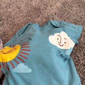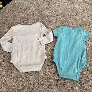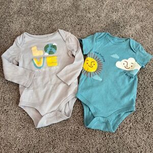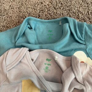 Fair used condition, size 12-18 months, dip brand. The purple onesie has some light bleach staining on the back (from my son's daycare using bleach on the changing pad), and the blue onesie has faint food staining. Still super cute and great quality. Bundle to save!