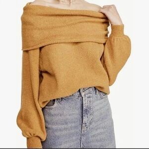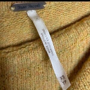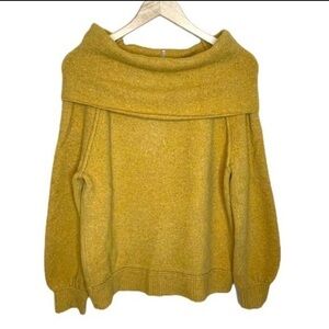 free people echo beach pullover sweater in honeycrisp heather. its like a warm yellow with hints of colors in the fabric as seen in pics. fuzzy on the outside and soft. good condition, no holes no stains. smoke free. balloon sleeves. can be worn as like a cowl neck or off the shoulders or maybe even one shoulder.