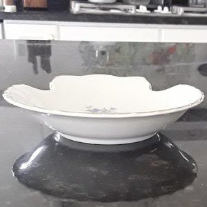 Creamy white ceramic dish has colorful flowers in the middle and gold trim around the scalloped edge.