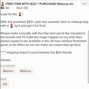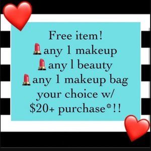 With any purchase $20+, pick any cosmetic item, makeup bag or other goodies marked with a 💄 by it and get it for free!