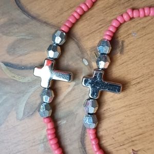 Elastic, seed beads, coral and metallic multifaceted beads featuring a silvertone lacy heart enclosing a cross pendant.