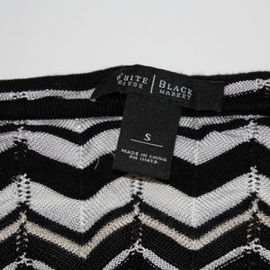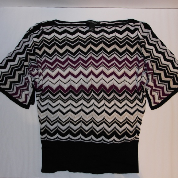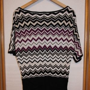 A gorgeous lightweight sweater from White House Black Market. Chevron stripes in purple, black, white, and subtle metallic silver and gold. Split dolman sleeves and a black ribbed banded waist make this shirt flowing and extremely flattering. This shirt looks perfect with black skinny pants, and a long sleeve black shirt underneath can help this transition into the winter months. Good used condition, worn only a few times. 22 1/2" long. For FREE offer, just add to a bundle with at least one other (not free) item and I will send you an offer.