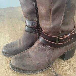 FREEBIRD by Steven Clive Tall Leather Heeled Boot, Brown, Distressed Buckle Detail, Size 8